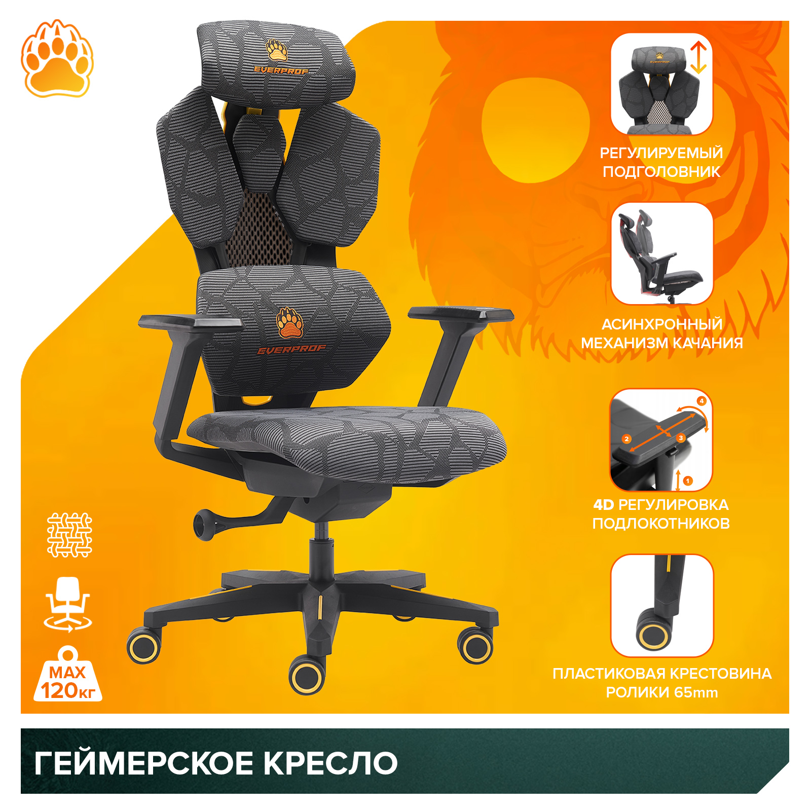 Everprof Tiger — это воплощение силы и комфорта в мире геймерских кресел. Созданное для тех, кто ценит качество и функциональность, кресло станет вашим надёжным союзником в долгих игровых баталиях.