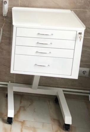 Столик стоматолога металлический, столешница с трехсторонней отбортовкой высотой 16мм, 4 ящика на роликовых направляющих. Корпус с ящиками установлен на одной опоре и П-образном основании. Внутренний размер каждого из трех верхних ящиков - 386х449х29мм;размер передней панели-424х70мм. Внутренний размер нижнего ящика -386х449х99мм; размер передней панели-424х136мм.Ящики столика запираются с помощью центрального замка. Размер столешницы 512х512мм. Равномерно распределенная нагрузка на столешницу - 5кг. Столик установлен на импортные обрезиненные колеса Ø50 мм. Материал: ящики, столешница - сталь листовая толщиной 1,0 мм, основание - профильная квадратная труба 50х50х1,5мм. Покрытие порошковое полимерное, цвет белый. Поставляется в собранном и упакованном виде