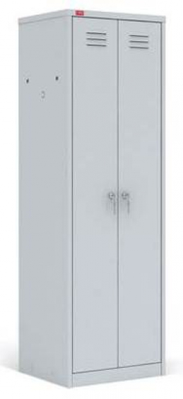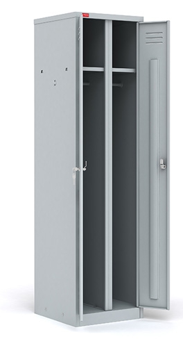 - Двухсекционный металлический шкаф (локер): Каждая секция оснащена съемной полкой для головного убора, перекладиной для вешалки и крючками для одежды, что обеспечивает удобство и порядок.