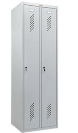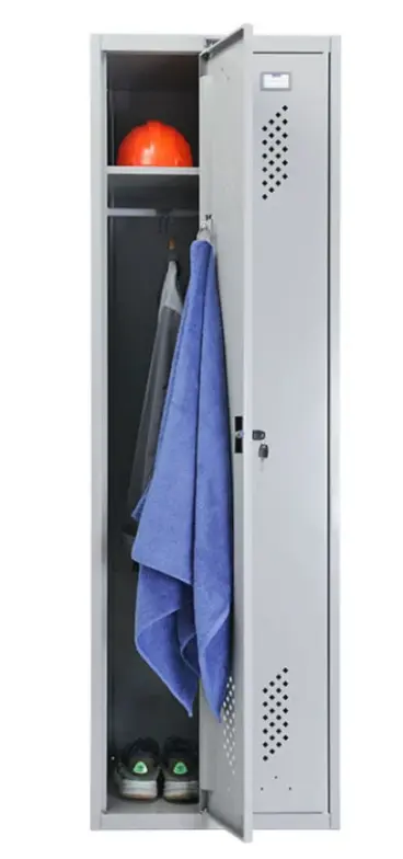 - Двухсекционный металлический шкаф (локер): Каждая секция оснащена съемной полкой для головного убора, перекладиной для вешалки и крючками для одежды, что обеспечивает удобство и порядок.